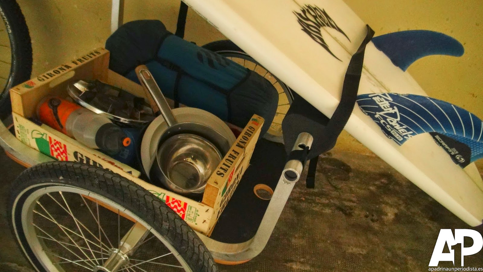 El carrito que llevará detrás atado en su bicicleta