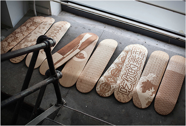 What is a laser engraved skateboard you ask? Laser engraving is a high tech process that uses super powerful light (a laser) to apply art to the board instead of the conventional method of laminating the board with a printed graphic. To accomplish this the laser burns away a small layer of wood that creates an awesome embossed effect that you can see and feel while allowing the grain of the board to show through. If you wanna know more about this project click