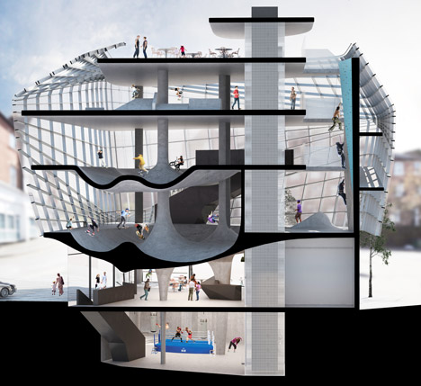Guy Hollaway Architects presented the idea of building a 5 floor skatepark in England, and the skater community is more than excited about it. The concept is to keep the shape of a parking building but adding some different ramps, rails and different stuff to practice any kind of action sport. You would start from the 5th floor and you would skate all the way down to the first one.