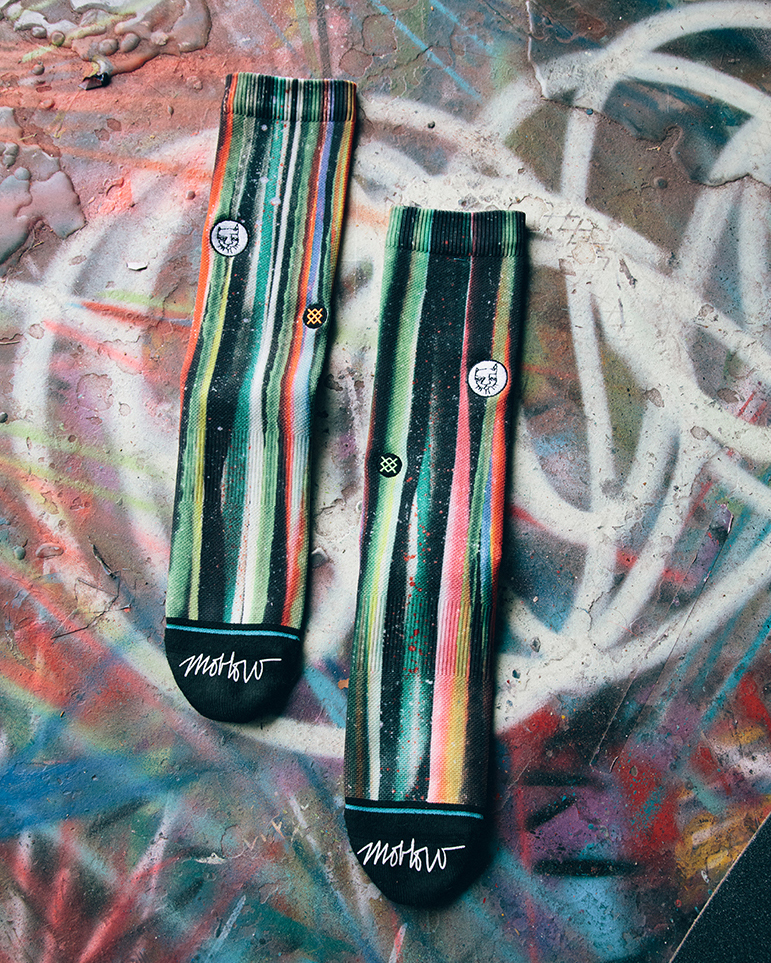 En su extensa carrera, el arte siempre ha sido su fuente de escape, una vocación que la ha llevado a trabajar como ilustrador, realizando collages, pintando murales, instalaciones y ahora, cerrando una colaboración junto Stance. Tres modelos de calcetines y un diseño de underwear componen su primera cápsula junto la firma californiana. Su carácter urbano y desenfadado, con doodles y combinaciones de color imposibles a spray le definen. Una cápsula que sin duda, sigue el leitmotiv de Stance: #TheUncommonThread