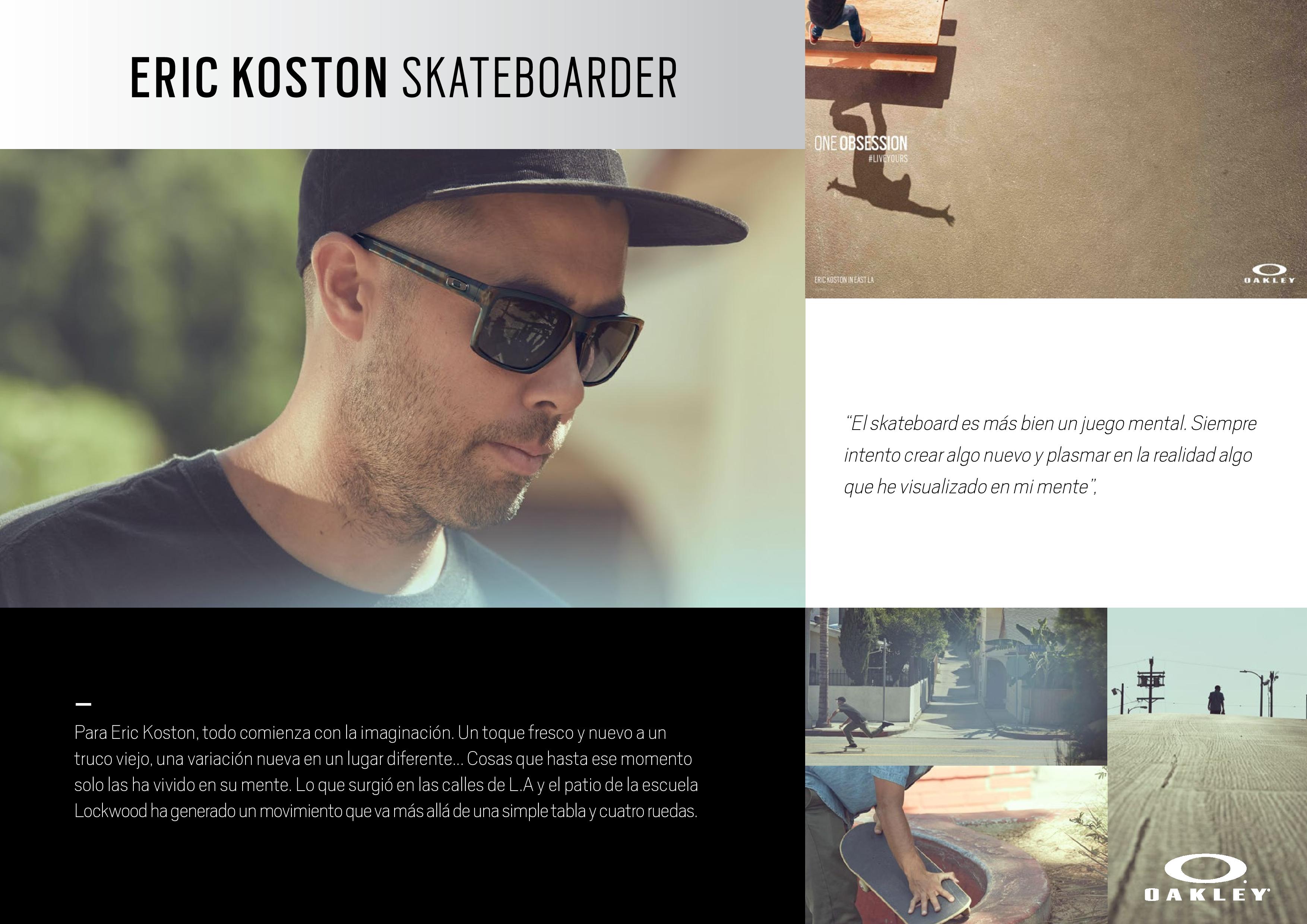 Con esta campaña Oakley rinde homenaje a aquellos que persiguen sus pasiones sin descanso y anima a todos aquellos a quienes mueve una única obsesión: convertir sus ideas en realidad. El vídeo de esta segunda entrega de la campaña de Oakley: "Eric Koston One Obsession”, nos cuenta en primera persona la obsesión que el skateboarding despierta en Eric Koston, uno de los más grandes riders de la historia.